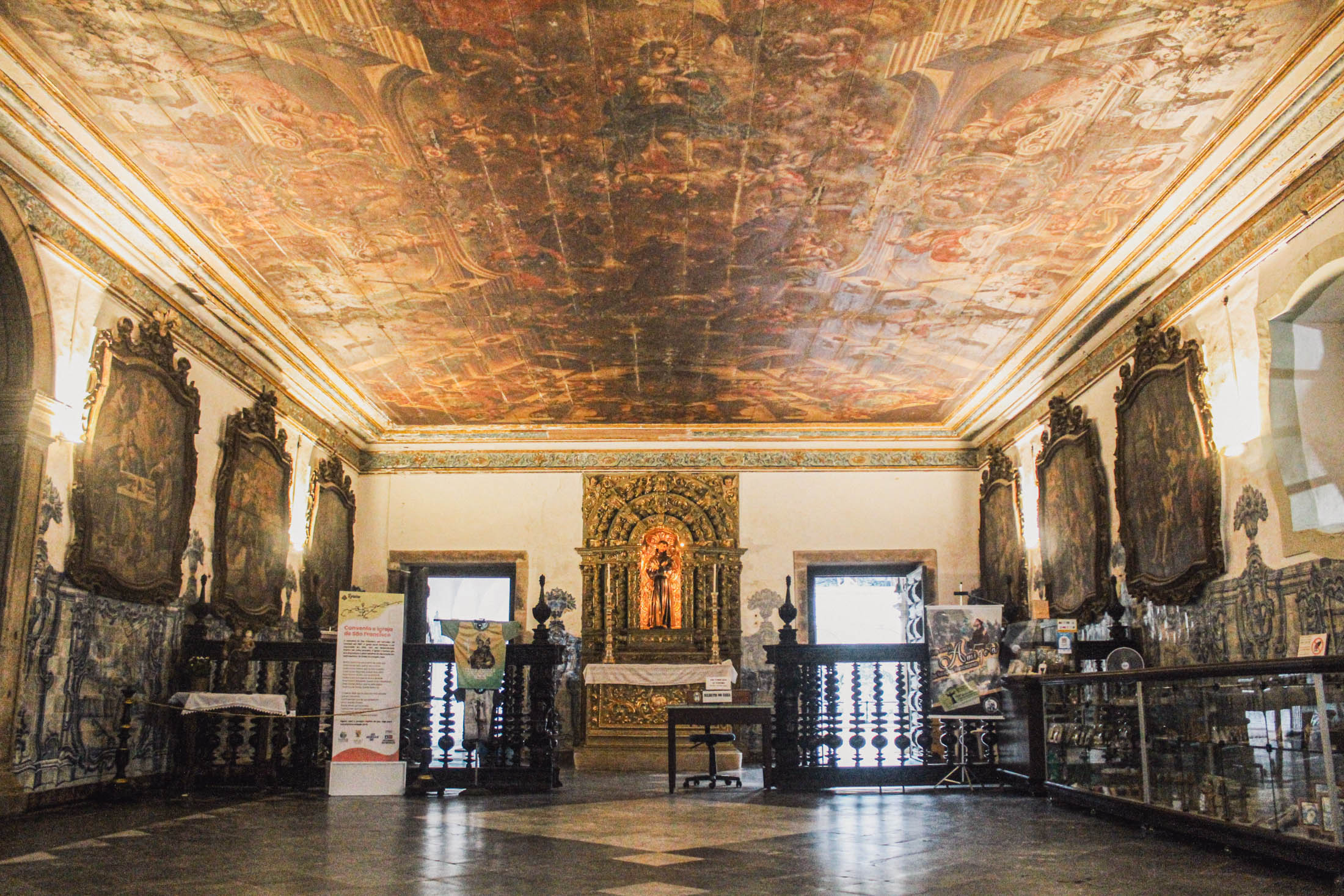 O teto é riquíssimo, com medalhões de papas franciscanos, santas e santos da Ordem.